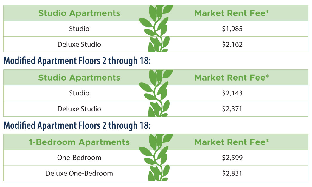 Residents may choose from one of three apartment styles and sizes, according to availability: